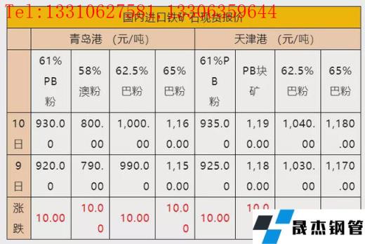 2月10日,青島港鐵礦石現貨價格普遍上漲,61%PB粉礦上漲10收930元/噸,58%澳粉上漲10收800元/噸,62.5%巴粉上漲10收1000元/噸,65%巴粉上漲10收1160元/噸;天津港鐵礦石現貨價格也普遍上漲,61%PB粉礦上漲10收935元/噸,PB塊礦上漲10收1190元/噸,62.5%巴粉上漲10收1040元/噸,65%巴粉上漲10收1180元/噸。