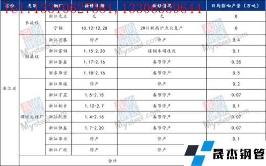 據調研,截至1月28日,浙江省內無縫鋼管廠家已處于春節停產狀態,日均影響產量較上周2.1萬噸相比維持不變。長流程無縫鋼管廠家浙江元立螺紋鋼生產目前正常;寧鋼1座2500立方高爐已點火復產。短流程無縫鋼管廠家浙江萬泰、浙江富鋼、浙江譽鑫、麗水華宏均受春節影響已經處于停產狀態,復產時間預計2月中旬左右,日均影響產量1.35萬噸;調坯軋材廠臨近春節的緣故,目前也皆處于停產狀態,日均影響產量0.75萬噸,復產時間預計2月中旬左右。具體復產時間以無縫鋼管廠家公布時間為準。綜合來看,浙江省內無縫鋼管廠家總計日均影響產量2.1萬噸左右,較上周維持不變。具體檢修情況詳見下圖:
