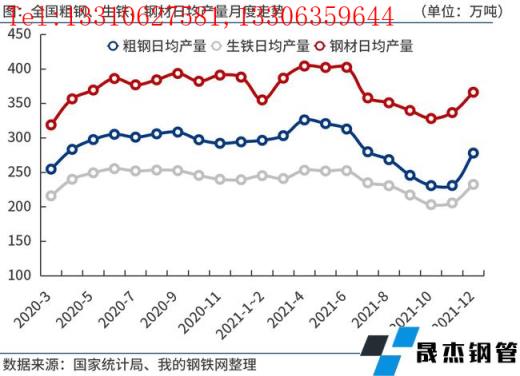 2021年12月份,全國粗鋼日均產量278.04萬噸,環比大增20.3%,預計1月份產量變化不大。臨近春節假期,鋼市進入傳統需求淡季。不過,由于多部門集中出臺穩增長政策,市場情緒得到提振,加之無縫鋼管廠家集中補庫,原燃料價格強勢上漲,推動鋼價震蕩偏強運行。今年我國基建投資有望發力,但房地產投資不容樂觀,鋼鐵消費或弱于去年。如果節后無縫鋼管廠家適度控制產能釋放,合理安排復工復產進度,實現供需動態平衡,鋼價或延續震蕩偏強運行。
