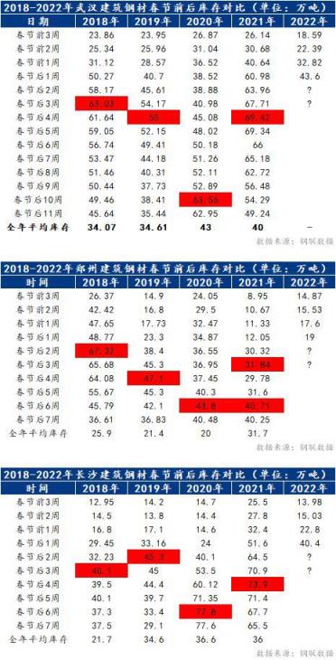 小編匯總近5年春節后7周中南區域建筑厚壁無縫鋼管庫存變化及庫存峰值時間節點。具體情況如下表所示: