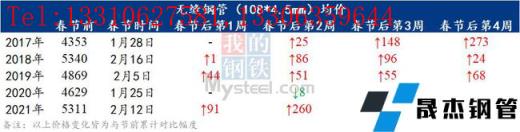小編匯總近5年春節后四周無縫厚壁鋼管均價變化情況,以供參考。從近5年時間來看,無縫管以上漲為主,只有2020年由于公共衛生事件影響,需求遲遲無法啟動,導致價格回落,其他幾年都出現了“開門紅”。