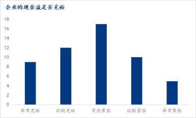 調(diào)研樣本企業(yè)中,現(xiàn)金流非常充裕(維持半年以上)的企業(yè)占比為16.98%,現(xiàn)金流比較充裕(維持3-6個(gè)月)的企業(yè)占比有22.64%,現(xiàn)金流有些緊張(維持1-3個(gè)月)的企業(yè)占比有32.08%,現(xiàn)金流比較緊張(維持1個(gè)月)的企業(yè)占比有18.87%,現(xiàn)金非常緊張(基本沒(méi)有現(xiàn)金流)的企業(yè)占比為9.43%。