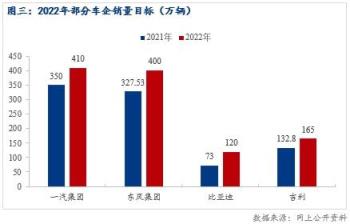 隨著2021年年底芯片緊張問題得到逐漸緩解。展望2022年汽車市場,如不再受到“缺芯”影響,汽車產(chǎn)能可以得到良好的釋放。從汽車銷售市場來看,在供給得到改善的情況下,今年的汽車銷量仍會(huì)保持較高增長,其中包含回補(bǔ)去年由于產(chǎn)量不足而導(dǎo)致的銷量缺失部分。我們?cè)诰W(wǎng)上公開資料了解到,各大車企在制定今年的銷量目標(biāo)時(shí)都是保持穩(wěn)增長的態(tài)勢。在此做了簡單整理: