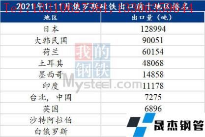 2021年1-11月,俄羅斯硅鐵合計(jì)出口39萬(wàn)噸,其中出口至日本12.899萬(wàn)噸,韓國(guó)9萬(wàn)噸,印度1.12萬(wàn)噸,占據(jù)總出口量約59%.。據(jù)俄羅斯相關(guān)企業(yè)透露,2021年俄羅斯硅鐵產(chǎn)量56.48萬(wàn)噸,出口量42.54萬(wàn)噸。