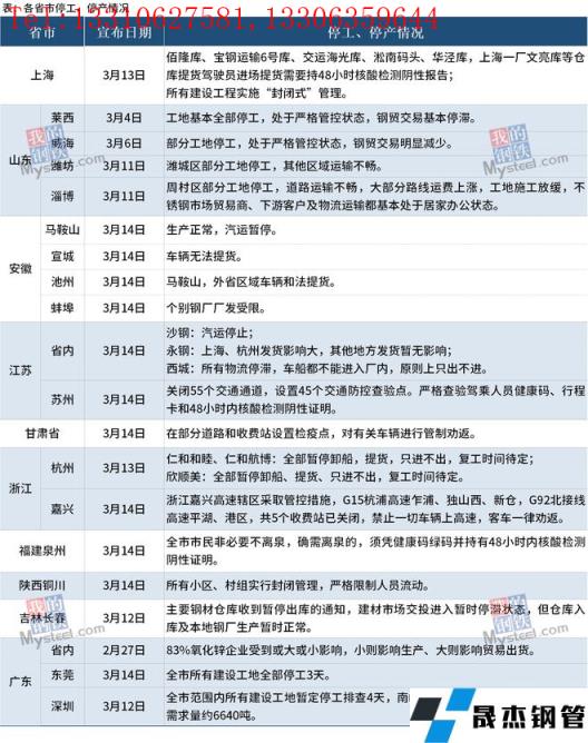 近期,全國疫情呈現(xiàn)局部高度聚集和多點散發(fā)態(tài)勢,對國內(nèi)大宗商品市場的供應(yīng)端、需求端、物流及倉儲等方面都有不同程度的影響。據(jù)統(tǒng)計,截至3月15日,全國多個省市發(fā)布停工停產(chǎn)情況。其中受疫情影響最大的吉林省于3月12日宣布,長春市主要厚壁無縫鋼管倉庫暫停出庫,當(dāng)?shù)亟ú氖袌鼋煌哆M入暫時停滯狀態(tài),倉庫入庫及本地?zé)o縫厚壁鋼管廠家生產(chǎn)暫時正常。深圳市于3月12日宣布,全市范圍內(nèi)所有建設(shè)工地暫定停工排查4天,南山及福田區(qū)域厚壁無縫鋼管市場預(yù)計共影響需求量約6640噸。與此同時,全國其他地區(qū)鋼貿(mào)交易也受到影響,部分工地開始停工,物流運輸暫停服務(wù)。具體情況如下: