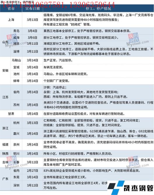 據(jù)統(tǒng)計(jì),截至3月15日,全國多個(gè)省市發(fā)布停工停產(chǎn)情況。其中受疫情影響最大的吉林省于3月12日宣布,長春市主要厚壁無縫鋼管倉庫暫停出庫,當(dāng)?shù)亟ú氖袌鼋煌哆M(jìn)入暫時(shí)停滯狀態(tài),倉庫入庫及本地?zé)o縫厚壁鋼管廠家生產(chǎn)暫時(shí)正常。深圳市于3月12日宣布,全市范圍內(nèi)所有建設(shè)工地暫定停工排查4天,南山及福田區(qū)域厚壁無縫鋼管市場預(yù)計(jì)共影響需求量約6640噸,深圳全市范圍初步預(yù)計(jì)共影響建筑厚壁無縫鋼管需求量約6萬噸。與此同時(shí),全國其他地區(qū)鋼貿(mào)交易也受到影響,部分工地開始停工,物流運(yùn)輸暫停服務(wù)。具體情況如下: