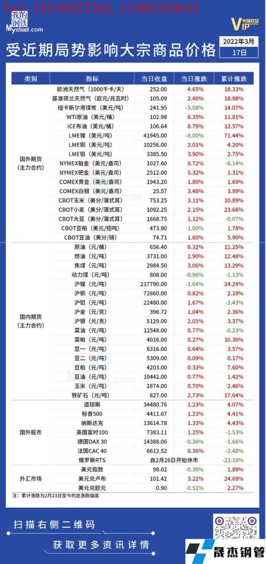 免責聲明:本網站(山東聊城晟杰無縫鋼管廠www.uldzz.cn)刊載的“受近期局勢影響大宗商品價格一覽表(3月17日)”等均源于網絡,版權歸原作者所有,且僅代表原作者觀點,本文所載信息僅供參考。轉載僅為學習與交流之目的,如無意中侵犯您的合法權益,請及時聯系刪除。本網站刊登此篇文章并不意味著本站贊同其觀點或證實其內容的真實性,我們不對其科學性、嚴肅性等作任何形式的保證。如果侵犯了您的版權,請盡快聯系我們予以撤銷,謝謝合作!