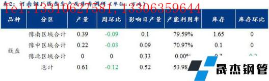 1、調研數據顯示,統計的河南地區10家建筑厚壁無縫鋼管樣本無縫厚壁鋼管廠家中,河南省無縫厚壁鋼管廠家線盤日均產量0.61萬噸,較上周產量減少0.12萬噸;線盤產能利用率53.98%,較上周下降16.44%。