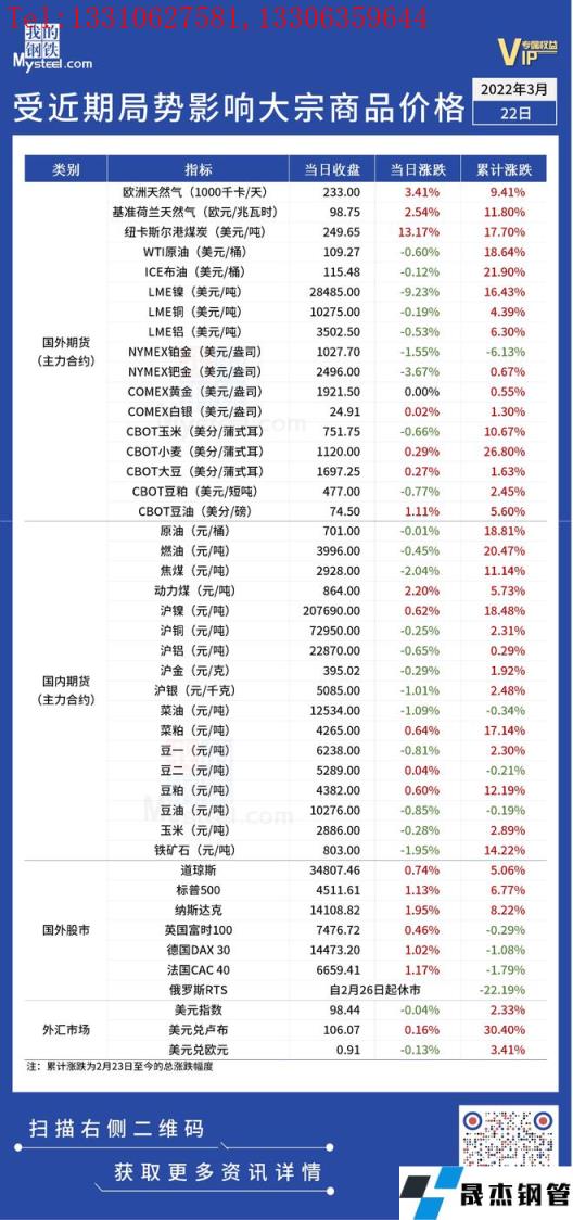 免責聲明:本網站(山東聊城晟杰無縫鋼管廠www.uldzz.cn)刊載的“受近期局勢影響大宗商品價格一覽表(3月22日)”等均源于網絡,版權歸原作者所有,且僅代表原作者觀點,本文所載信息僅供參考。轉載僅為學習與交流之目的,如無意中侵犯您的合法權益,請及時聯系刪除。本網站刊登此篇文章并不意味著本站贊同其觀點或證實其內容的真實性,我們不對其科學性、嚴肅性等作任何形式的保證。如果侵犯了您的版權,請盡快聯系我們予以撤銷,謝謝合作!