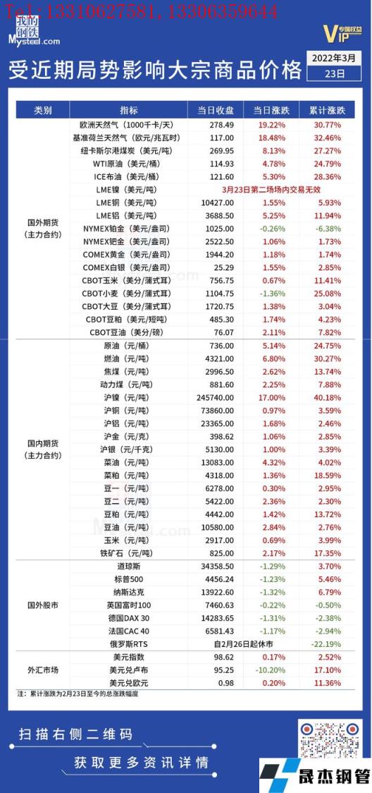 近期,受國際局勢影響,全球金融及大宗商品市場出現(xiàn)較大波動。3月23日,國際油價、能源價格大漲,倫敦金屬交易所(LME)表示,3月23日鎳的第二場場內(nèi)交易將被視為受到干擾,該交易期間達成的所有交易將無效。匯總情況如下: