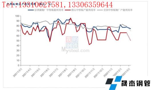 由于前期京津冀地區(qū)受到“2+26”座城市秋冬季限產(chǎn)、冬殘奧會限產(chǎn)等政策,產(chǎn)能利用率出現(xiàn)了明顯的下滑。隨著采暖季的結(jié)束以及東殘奧會的閉幕,鋼企的產(chǎn)能利用率出現(xiàn)了回升,截至3月18日,全國中厚板鋼企產(chǎn)能利用率79.13%,京津冀地區(qū)中厚板鋼企產(chǎn)能利用率77.55%,唐山地區(qū)中厚板鋼企產(chǎn)能利用率為65.53%,隨著3月19日唐山疫情突發(fā),無縫厚壁鋼管廠家的復(fù)產(chǎn)節(jié)奏與物流均受到了影響,當(dāng)下原料供給是當(dāng)下比較棘手的問題,短期內(nèi)爐料補給不足,鋼企被迫停產(chǎn)的可能性較大。預(yù)計3月底,唐山中厚板產(chǎn)能利用率或?qū)⒋蠓陆担珖泻癜邃撈螽a(chǎn)能利用率預(yù)計在70%左右。