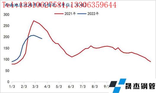 據西南地區近五年歷史庫存數據來看,庫存峰值基本在第三周或第四周出現(除去2020年疫情影響庫存峰值出現在第七周),節后累庫周期基本為2-3周,2022年西南地區建筑厚壁無縫鋼管峰值出現在第五周,累庫周期較往年長。峰值過后第一周去庫4.41萬噸,降幅2.13%,第二周去庫5.69萬噸,降幅2.8%,較往年去庫速度偏緩慢。主要原因是:1、今年春節時間較往年靠前,受極端天氣影響,春節后西南地區經歷兩次降溫降雪天氣,影響出貨節奏;2、西南地區下游回款進度僅60%左右,下游資金緊張,影響項目施工節奏,據了解,西南地區多數新開工項目要延期至4月中旬以后。3、全國疫情再次擴散,下游施工受阻;4、其他因素,運費上漲、貴州開啟施工項目安全大檢查等。綜上原因,西南地區建筑厚壁無縫鋼管庫存累庫周期長,去庫速度緩慢。