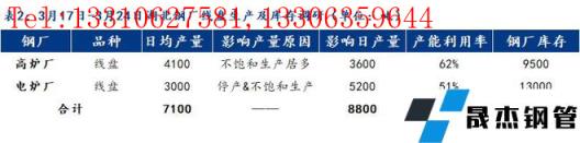 2、湖北省無(wú)縫厚壁鋼管廠家線盤(pán)日均產(chǎn)量0.71萬(wàn)噸,周環(huán)比減少0.33萬(wàn)噸;檢修/限產(chǎn)影響線盤(pán)日產(chǎn)量為0.88萬(wàn)噸,產(chǎn)能利用率45%,較上周減少31%。