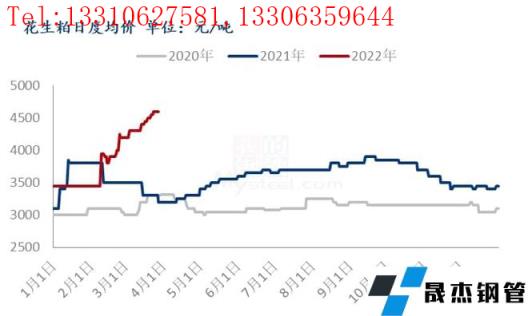 眾所周知,3月份豆粕價格持續偏強,多次創新高?;ㄉ蓛r格在其帶動下強勢上漲,截至今日,花生粕均價為4600元/噸,相較春節前3450元/噸上漲1050元/噸,漲幅高達30.43%;與去年同期3500元/噸相比上漲1000元/噸,漲幅28.57%,創下近三年新高。而春節前由于花生油消費情況一般,油廠加工量較少,導致花生粕庫存低位運行,使其高價更加有所支撐,油廠見狀紛紛選擇提升壓榨量,也一定程度上帶動了原料花生的行情。但目前豆粕市場已逐步回歸理性,價格觸頂回落,花生粕價格隨之下行可能性較大。一旦影響到壓榨利潤,油廠的對花生的收購積極性也會下降,拖累花生價格。