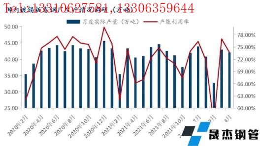 調(diào)研數(shù)據(jù)顯示:據(jù)監(jiān)測的26家鍍錫板生產(chǎn)企業(yè)中,共計(jì)49條產(chǎn)線,2022年4月份產(chǎn)能利用率73.68%,月環(huán)比下降3.31%,同比下降1.09%;4月實(shí)際產(chǎn)量42.14萬噸,月環(huán)比減少0.87萬噸,同比減少0.55萬噸。從4月份供應(yīng)看,月環(huán)比小幅下降,主要是江蘇地區(qū)部分無縫厚壁鋼管廠家因疫情影響,原料供應(yīng)收到影響,導(dǎo)致該區(qū)域馬口鐵產(chǎn)量收到影響。從歷年馬口鐵供應(yīng)看情況看每月40-45萬噸處于相對正常水平,3-4月國內(nèi)馬口鐵供應(yīng)恢復(fù)正常水平。