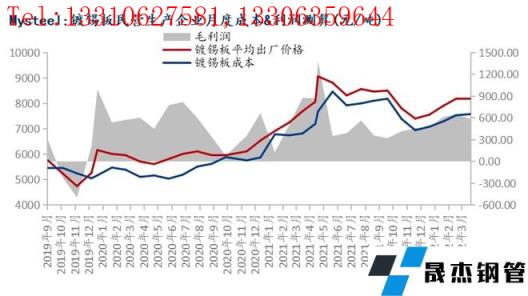 對民營企業(yè)成本&利潤測算數(shù)據(jù)顯示:2022年4月份鍍錫板生產(chǎn)成本7576.51元/噸,月環(huán)比增加48.2元/噸;毛利583.49元/噸,月環(huán)比下降68.2元/噸,同比下滑284.27元/噸,全流程企業(yè)整體利潤尚可。4月基板結(jié)算成本增加、疫情影響下,運(yùn)輸成本上漲明顯,錫錠成本窄幅回調(diào),鍍錫板出廠價(jià)格挺價(jià)意愿偏弱。
