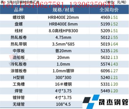 中厚板:5月10日,全國24個主要城市20mm普板均價5235元/噸,較上個交易日下跌26元/噸。從供給端來看,目前全國中厚板鋼企生產偏飽和,產量進一步釋放空間有限,上半年中板產量高點大概率已經出現在4月下旬結合今年的壓減粗鋼產量政策,當前正是減產檢修的最佳時機,加之部分無縫厚壁鋼管廠家虧損,未來或有下降空間。隨著物流運輸較前期有所改善,運力也會得到釋放,如果需求得不到較好的釋放,庫存壓力或許在未來有所體現。綜合來看,預計11日全國中厚板市場價格小幅震蕩調整為主。