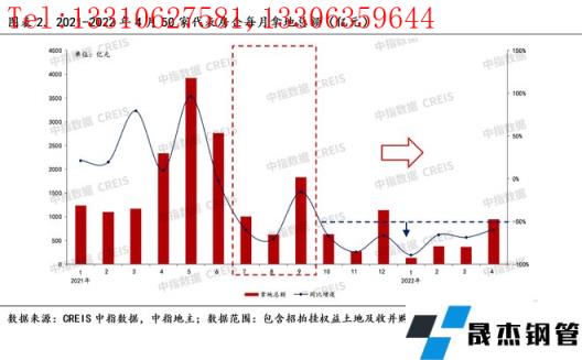 那么,預判今年用鋼情況的話,可以參考從2021年-2022年4月份以來的50家代表房企每月拿地總額數據,假如往前倒推6個月,2022年1月起的房地產用鋼情況大致可以參照2021年7月起的拿地數據,因為它并非一一對應的關系。我們可以看到,從2021年10月以來的拿地數據不容樂觀,單月同比跌幅持續低于-50%水平線以下,預示接下來三季度的房地產新開工以及其用鋼情況理論上應該是很差的。
