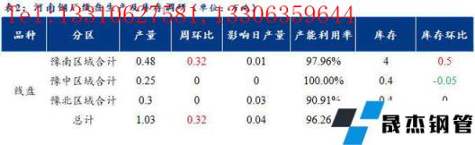 1、調(diào)研數(shù)據(jù)顯示,統(tǒng)計(jì)的河南地區(qū)10家建筑厚壁無(wú)縫鋼管樣本無(wú)縫厚壁鋼管廠家中,河南省無(wú)縫厚壁鋼管廠家線盤日均產(chǎn)量1.03萬(wàn)噸,較上周增加0.32萬(wàn)噸;檢修/限產(chǎn)影響建材日產(chǎn)量為0.04萬(wàn)噸,產(chǎn)能利用率96.26%,較上周上升29.91%。