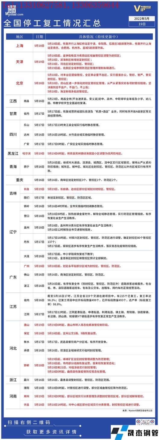 免責聲明:本網站(山東聊城晟杰無縫鋼管廠www.uldzz.cn)刊載的“疫情影響丨全國停工復工情況匯總(5月19日)”等均源于網絡,版權歸原作者所有,且僅代表原作者觀點,本文所載信息僅供參考。轉載僅為學習與交流之目的,如無意中侵犯您的合法權益,請及時聯系刪除。本網站刊登此篇文章并不意味著本站贊同其觀點或證實其內容的真實性,我們不對其科學性、嚴肅性等作任何形式的保證。如果侵犯了您的版權,請盡快聯系我們予以撤銷,謝謝合作!