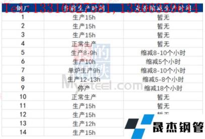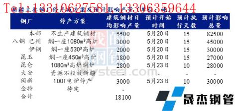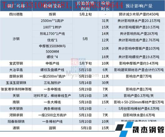 據(jù)不完全統(tǒng)計,截至5月20日,國內13家無縫厚壁鋼管廠家發(fā)布檢修計劃。其中,中天鋼鐵因一座轉爐檢修,坯料不足,兩條棒材線停產檢修,預計5月份影響棒材產量4.5萬噸。