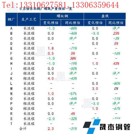 據(jù)4月底的調(diào)研,5月東北無縫厚壁鋼管廠家螺紋和盤線的計(jì)劃產(chǎn)量分別為119.5萬噸和95.9萬噸,同比減少57.1萬噸和26.3萬噸,環(huán)比增加10.5萬噸和12.3萬噸;受市場價格下行影響,無縫厚壁鋼管廠家虧損幅度擴(kuò)大,部分多品種生產(chǎn)的無縫厚壁鋼管廠家根據(jù)各品種的虧損幅度和訂單情況進(jìn)行品種間的轉(zhuǎn)產(chǎn),單一生產(chǎn)螺線的無縫厚壁鋼管廠家部分復(fù)產(chǎn)、部分加大減產(chǎn),具體情況如下: