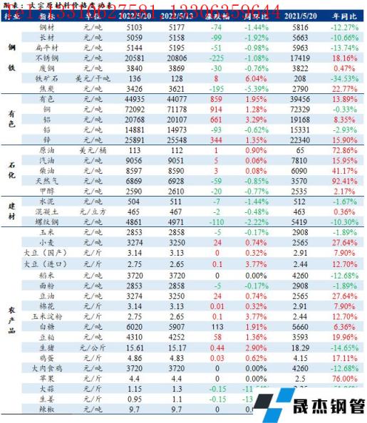 免責聲明:本網站(山東聊城晟杰無縫鋼管廠www.uldzz.cn)刊載的“周報:大宗工業原材料、能源及農產品價格周報(5.16-5.20)”等均源于網絡,版權歸原作者所有,且僅代表原作者觀點,本文所載信息僅供參考。轉載僅為學習與交流之目的,如無意中侵犯您的合法權益,請及時聯系刪除。本網站刊登此篇文章并不意味著本站贊同其觀點或證實其內容的真實性,我們不對其科學性、嚴肅性等作任何形式的保證。如果侵犯了您的版權,請盡快聯系我們予以撤銷,謝謝合作!