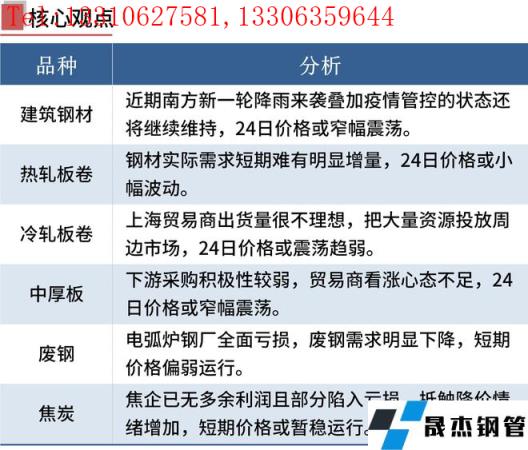 建筑厚壁無(wú)縫鋼管:5月23日,全國(guó)31個(gè)主要城市20mm三級(jí)抗震螺紋鋼均價(jià)4839元/噸,較上個(gè)交易日下跌10元/噸。短期來(lái)看,目前市場(chǎng)供應(yīng)端同比持續(xù)低位,同時(shí)近期南方新一輪降雨來(lái)襲疊加疫情管控的狀態(tài)還將繼續(xù)維持,消費(fèi)難有好轉(zhuǎn)預(yù)期。目前市場(chǎng)仍然處于供需雙弱的格局。短期市場(chǎng)關(guān)注點(diǎn)仍在于消費(fèi)能否有效恢復(fù)以及雨季對(duì)于消費(fèi)的影響,因此預(yù)計(jì)24日國(guó)內(nèi)建筑厚壁無(wú)縫鋼管現(xiàn)貨價(jià)格窄幅震蕩為主。