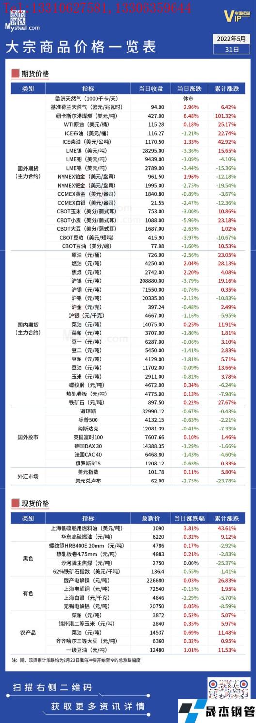 免責聲明:本網站(山東聊城晟杰無縫鋼管廠www.uldzz.cn)刊載的“俄烏局勢丨大宗商品價格一覽表(5月31日)”等均源于網絡,版權歸原作者所有,且僅代表原作者觀點,本文所載信息僅供參考。轉載僅為學習與交流之目的,如無意中侵犯您的合法權益,請及時聯系刪除。本網站刊登此篇文章并不意味著本站贊同其觀點或證實其內容的真實性,我們不對其科學性、嚴肅性等作任何形式的保證。如果侵犯了您的版權,請盡快聯系我們予以撤銷,謝謝合作!
