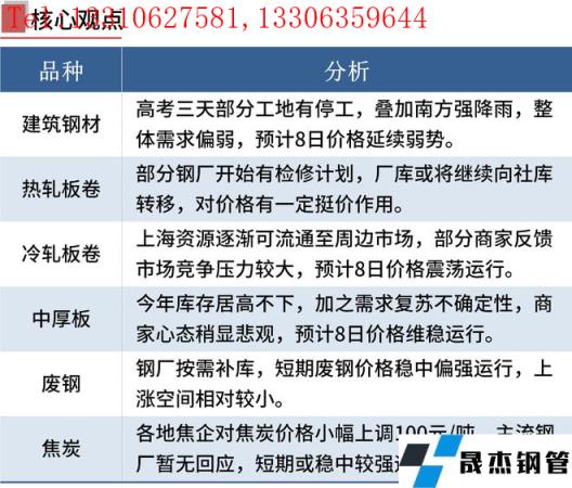 建筑厚壁無縫鋼管:6月7日,全國31個主要城市20mm三級抗震螺紋鋼均價4839元/噸,較上個交易日下跌15元/噸。高考三天,部分工地有停工,道路有封鎖,需求整體偏弱。疊加南方地區降雨天氣影響,整體需求仍然偏弱,因此預計8日國內建筑厚壁無縫鋼管價格或將延續弱勢運行態勢。