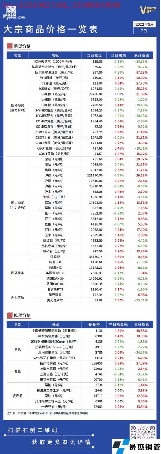 免責聲明:本網站(山東聊城晟杰無縫鋼管廠www.uldzz.cn)刊載的“俄烏局勢丨大宗商品價格一覽表(6月7日)”等均源于網絡,版權歸原作者所有,且僅代表原作者觀點,本文所載信息僅供參考。轉載僅為學習與交流之目的,如無意中侵犯您的合法權益,請及時聯系刪除。本網站刊登此篇文章并不意味著本站贊同其觀點或證實其內容的真實性,我們不對其科學性、嚴肅性等作任何形式的保證。如果侵犯了您的版權,請盡快聯系我們予以撤銷,謝謝合作!
