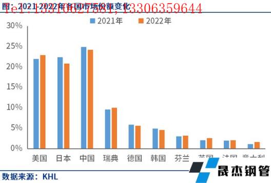 分國別來看,2022年全球各國市場份額排名前三的國家分別是中國、美國、日本,2022年這三個(gè)國家市場份額分別為24.2%、22.9%、20.8%,三個(gè)國家在全球市場份額已經(jīng)達(dá)到了67.9%。其中,中國和日本2022年市場份額分別下降0.7個(gè)百分點(diǎn)、1.6個(gè)百分點(diǎn),美國2022年市場份額提高1個(gè)百分點(diǎn)。