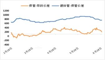 6月焊管較帶鋼價差由月初收至零軸后重新走擴,目前管廠廠內原料輪換周期拉長至15天左右,結算周期內焊管生產利潤平均虧損139元,架子管平均虧損129元;鍍鋅管較焊管價差擴大96元,綜合生產利潤有所改善,但整體仍處虧損邊緣。