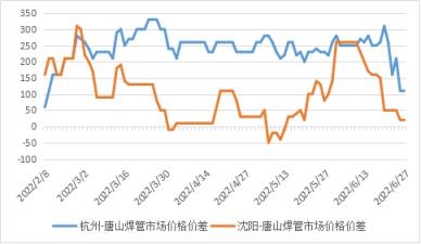 圖3 2022年杭州-唐山、沈陽-唐山焊管價差走勢圖
