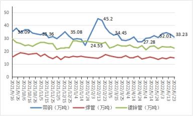 6月面臨美聯儲加息、國內宏觀經濟數據偏空雙重壓力,鋼市行情崩塌式探底,焊鍍管價格最高三天降幅達500元,需求傾向偏弱方向,但上游供應壓力不減,市場信心修復需要時間,行情持續壓制在低位運行。