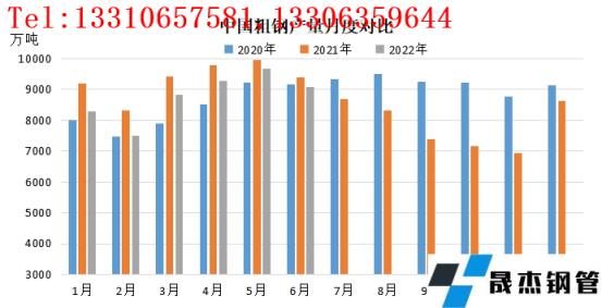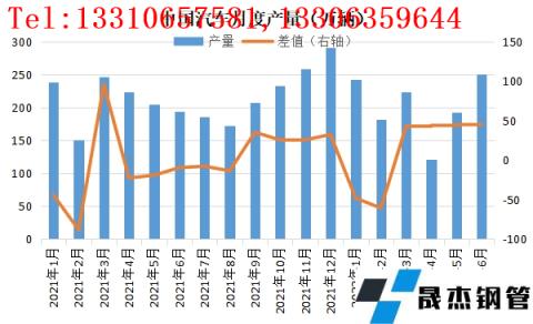 粗鋼產(chǎn)量與高爐開工情況走勢高度一致,受粗鋼減壓等因素影響,今年上半年我國粗鋼產(chǎn)量1-6累計粗鋼產(chǎn)量52688萬噸,同比下降6.5%;累計生鐵產(chǎn)量43893萬噸,同比下降4.7%;累計厚壁鋼管產(chǎn)量66714萬噸,同比下降4.6%。整體來看,今年上半年粗鋼產(chǎn)量最低值出現(xiàn)在2月份為7496萬噸,最高值出現(xiàn)在5月份為9661萬噸,6月份高位回落至9073萬水平。
